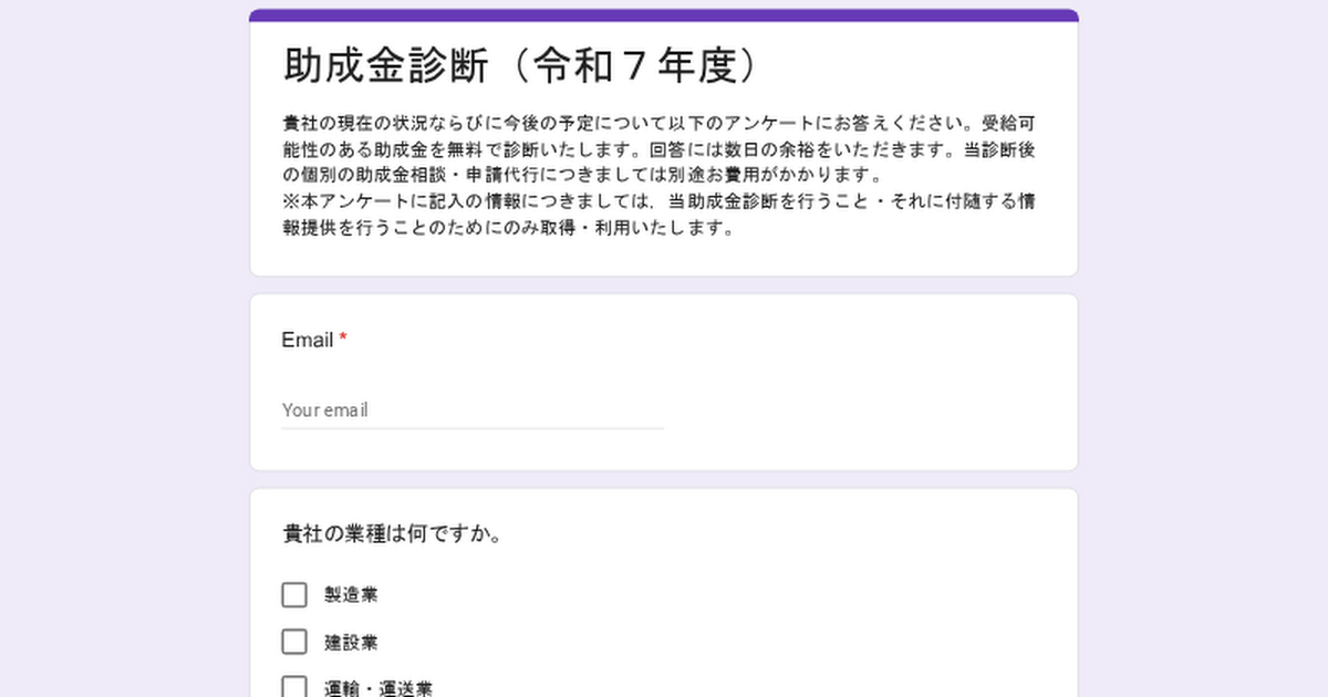 貴社の現在の状況ならびに今後の予定について以下のアンケートにお答えください。受給可能性のある助成金を無料で診断いたします。回答には数日の余裕をいただきます。当診断後の個別の助成金相談・申請代行につきましては別途お費用がかかります。※本アンケ...